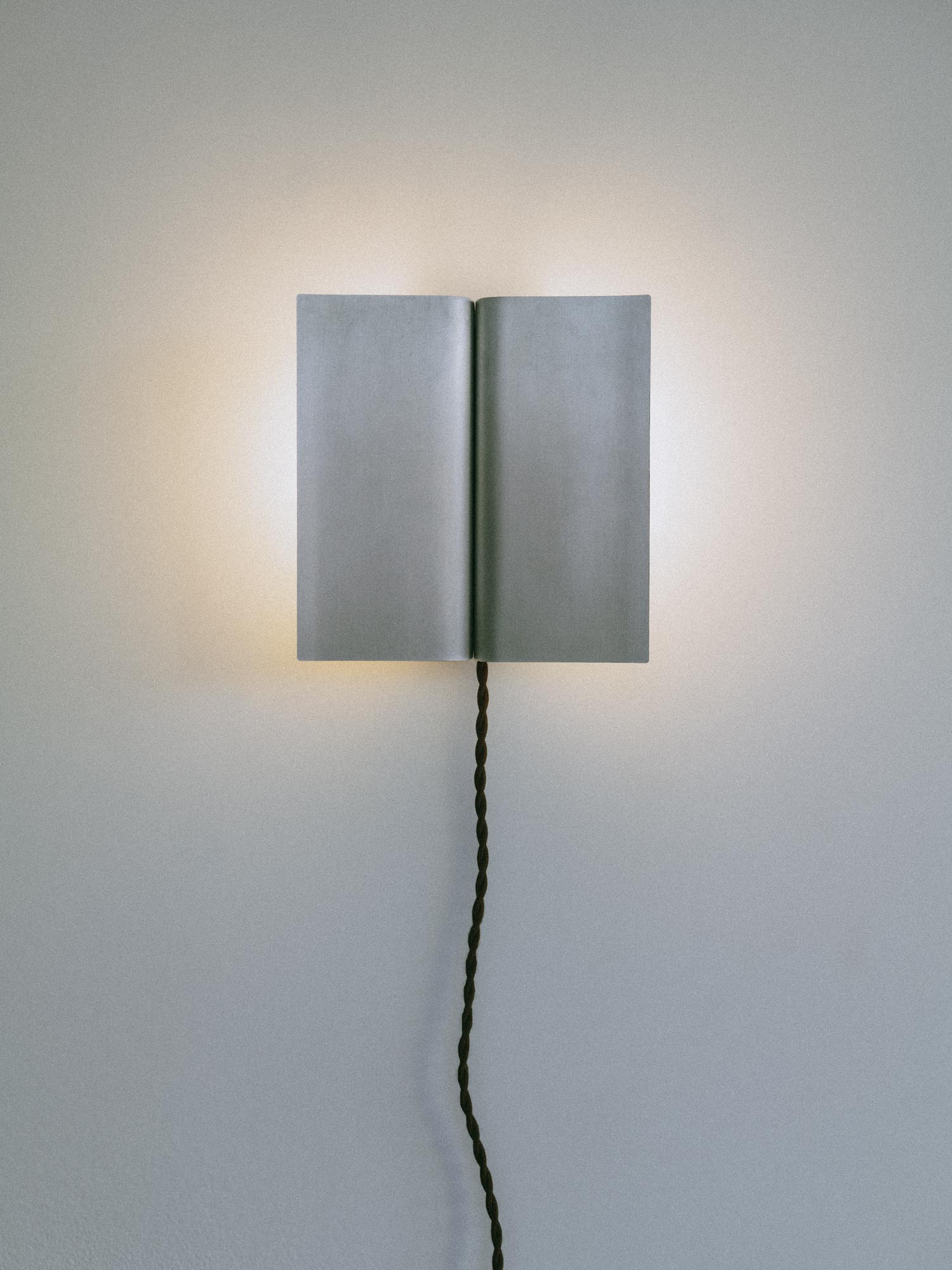 The fixture features two precisely machined symmetrical plates that cover and reflect twin bulbs, casting a radius of soft light across the wall. Made of natural brushed aluminum, the surface is left untreated to develop a subtle patina over time.